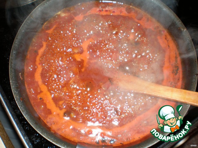 На сковороде обжарить нарезанный мелко лук, затем добавить томатную пасту, влить воду, добавить соль, перец, сахар