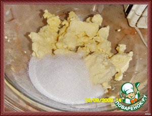 В комбайне или миксером взбить масло, добавить сахар, взбить до светлой пушистости.