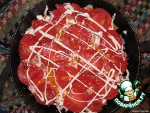 Затем слой нарезанных кольцами помидор, снова сетка из майонеза.