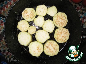 Баклажаны очистить от кожицы, и порезать кольцами 0,5-1 см. Уложить на дно формы, у меня сковорода. Форму перед этим смазать растительным маслом. Солью, перцем и приправами посыпаем только баклажанный слой.