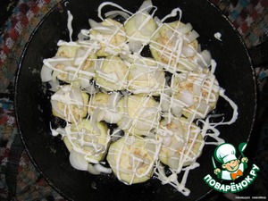 Порезать полукольцами лук и уложить сверху баклажан. Сделать сетку из майонеза.