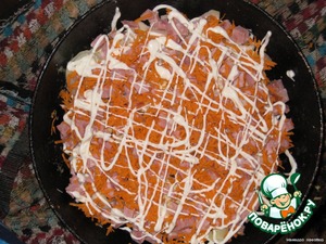 Следующий слой - натертая на мелкой терке сырая морковь, сверху сетка из майонеза
