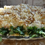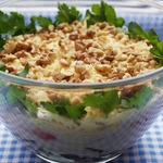Смазать майонезом. Украсить рублеными орехами, зеленью петрушки. Дать салату настояться несколько часов и на стол! -
