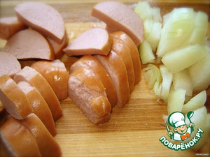 Колбасу (такую, которая вам нравится на завтрак) режем на кусочки. Мелко нарезаем лук и слегка поджариваем с колбасой. Не пережаривайте, лук должен хрустеть. -