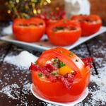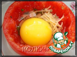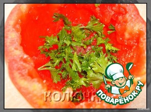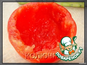 Итак, когда я поняла,что готовить нужно только для себя любимой, естественно все приготовила на 1 порцию. Берем большой помидор и срезаем шляпку,вынимаем серединку. Ее я не выбрасывала,завтра она вполне пойдет в соус для спагетти)