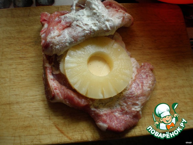 Достать свиные кусочки, развернуть кармашки выложить внутрь кусочек ананаса, ломтик сыра,