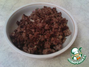 Варёное мяско прокручиваем в мясорубке. Лучок меленько режем,обжариваем вместе с нашим фаршиком на сковородке до золотистого красивого цвета ,солим перчим,даем немного остыть. -