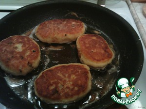 Формируем,как пирожки:из картофельного теста делаем лепешечку,в центр кладем начинку,краешки защипляем,обваливаем в муке приплющиваем,как сырник и кладём АККУРАТНО,чтоб не порвать,швом вниз на сковородку. -