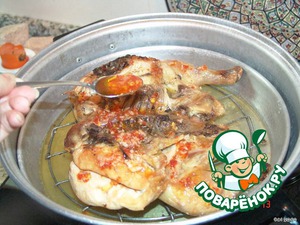Готового цыпленка режем на куски и подаем с остатком соуса.