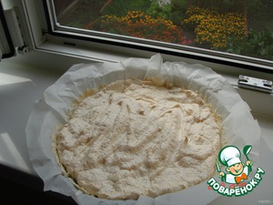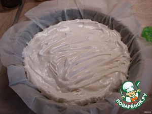 Второй корж готов. Форму охладить, застелить бумагой для выпечки и сформировать белковый корж. Выпекать в духовке 150 градусов (маленький огонь) 35-40 минут.