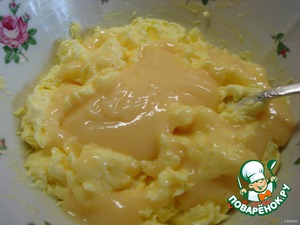 Пока выпекается, делаем крем: 200 г мягкого сливочного масла растереть с остывшей, заварной частью крема.
