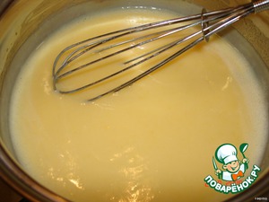 Пока выпекается первый корж, делаем заварную часть крема: смешать 2 желтка, 0,5 стакана сахара, добавить 1 ст. ложку муки (без верха) и 200 г молока. Поставить на небольшой огонь, помешивая венчиком, довести до кипения. По опыту - доводится до кипения в течение пяти минут. Снять с огня, отставить, чтобы охлаждался.