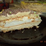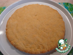 Первый корж готов. Снимать аккуратно, подсунув лопатку. Форму обдать холодной водой, чтобы остудить, смазать, сформировать второй корж и в духовку. Пока выпекается второй корж, взбиваем миксером 4 белка и 1 стакан сахара минут пять, до пиков.