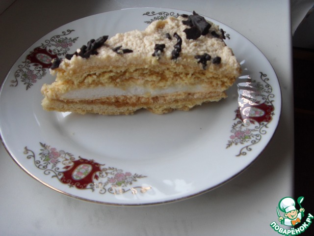 На нижний корж нанести часть крема, сверху белковый корж, затем еще крем и верхний корж с кремом. Украсить. У меня орехи, тертый темный и белый шоколад.