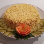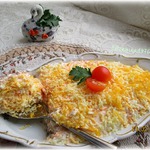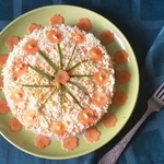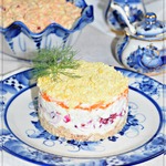 Этот салат из лосося в нашей семье делаем очень давно. Научила нас ему дедушкина жена. Добрая ей память. Как раз сегодня годовщина ее памяти. За фото салата благодарю Олю акчуч.