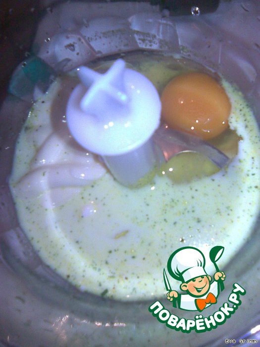 Взбить в блендере сливки, яйца, приправы, творожный сыр и зелень до образования массы консистенции жидкой сметаны...