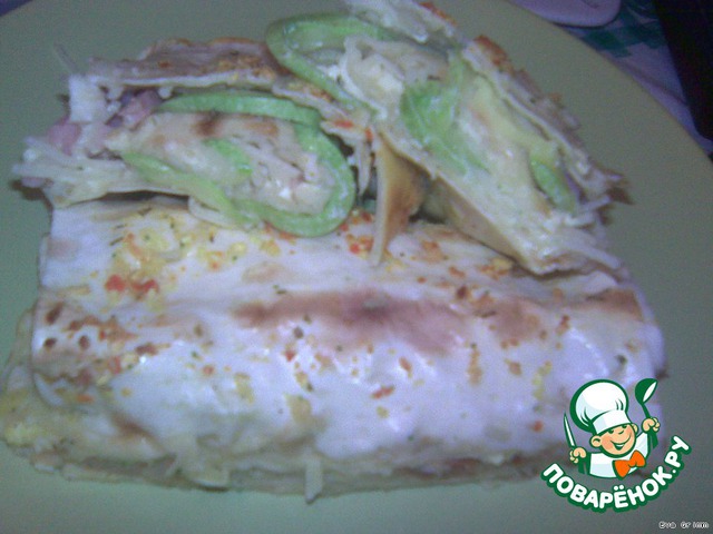 Скручиваем лавашики в рулет и выкладываем в форму, заливаем оставшимся яичным соусом...