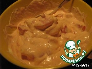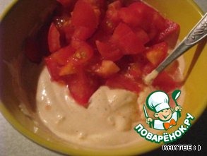Сметану, томатную пасту, майонез и чеснок (выдавленный чеснокодавкой) смешиваем :)