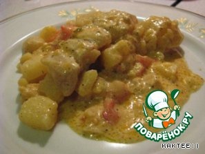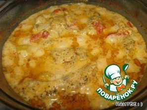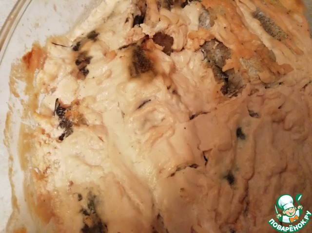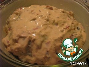 Сверху сметанную заправку выкладываем, накрываем крышкой и в духовку. Как булькать начнет, то минут 20-30 готовим при максимальной температуре ( у меня максимальная 265). Во время готовки можно пару раз заглянуть в форму и немного ложкой "подвигать" чтоб соус везде распространился.