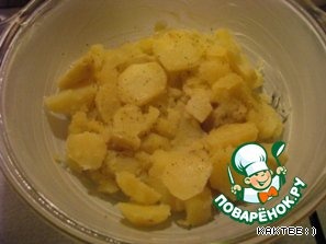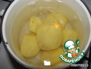 Картошку ставим вариться. как закипит - варим минут 10. Я немного замечталась и она у меня минут 20 варилась, по этому кружочками порезать (так было задумано вначале) ее не удалось :) -