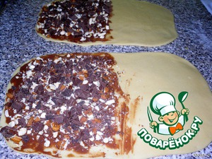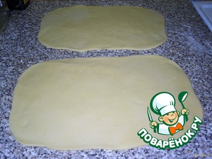 Тесто разделить пополам и раскатать два прямоугольника 20х25 см, примерно полсантиметра в толщину.