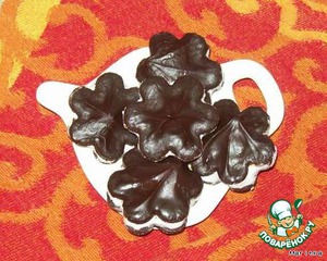 3. Глазурь: Для этого надо растопить шоколад на водяной бане с небольшим количеством молока. Затем берём каждое наше «сложное» печеньице и окунаем его верхней частью в шоколадную массу. Так как шоколад довольно-таки густой, то он не растекается по поверхности, а образует «шапочку», похожую на безе.