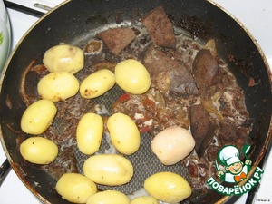 Итак, к остаткам печени добавляем картофель (ну вот такой у нас «крупногабаритный» урожай :-D, если у вас урожай лучше нашего, режьте помельче). По ходу пьесы я все же своих "гигантов" на 2 части разрезала.
