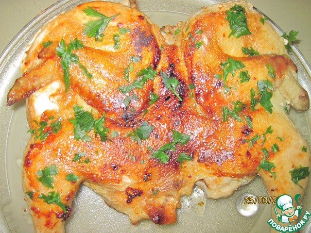 Вот такая она получается.Сфоткать успела только половинку.Если курица не прожарилась за данное время можно перевернуть её ещё раз, но следить чтобы не пригорела.На гарнир можно подать жареную картошку,овощи.