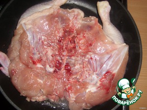 Далее раскладываем нашу курицу спинкой вверх и хорошенько отбиваем, чтобы тушка стала как можно более плоской.