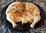 Курочку помыть, разрезать по грудке ( только спереди).Натереть солью, перцем, Давленым чесноком.По желанию можно оставить на несколько часов промариноваться, если времени мало этот момент пропускаем.