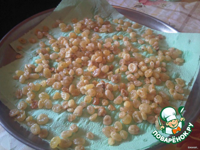 Изюм промыть, обсушить. Когда мало времени, сушу феном, может, кому пригодится идея.