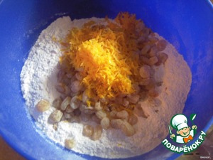• Изюм соединить с мукой, разрыхлителем и апельсиновой цедрой.