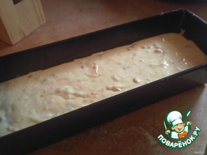 Соединить муку с жидкой смесью. Смазать форму маслом, дно выстелить бумагой, вылить тесто.