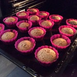 Готовила 14 минут (после 7 минут кексы еще не поднялись и верхушка была жидкая) - как только кексы поднялись и верхушка пропеклась, сразу достала.