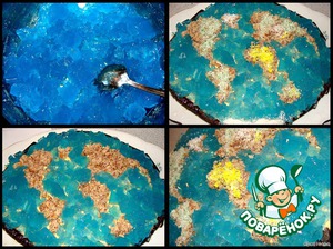 Для "морей-океанов" застывшее желе "разбила" вилкой-ложкой на кусочки и выложила на охлажденный торт.