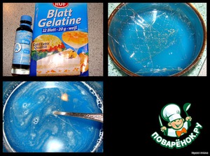 Накануне вечером сделала голубое желе (400 мл минеральной воды + 50 гр сахара - слегка подогрела, добавила пищевой краситель синего цвета и 6 пластинок желатина. Размешала до полного растворения желатина и поставила в холодильник).