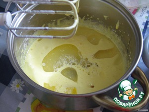Желтки взбить с другой половиной сахара, влить масло и воду