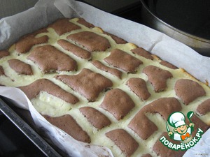 Смешать все для творожной массы (творог+сахар+крахма л+сметана) и отсадить из мешочка в виде решетки (моя решетка, как видите, кривая)))