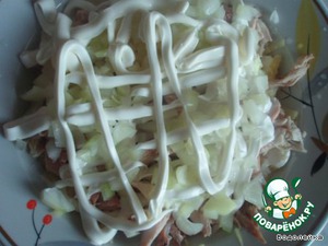 3 слой- лук (предварительно его замариновать или ошпарить кипятком) +майонез