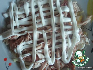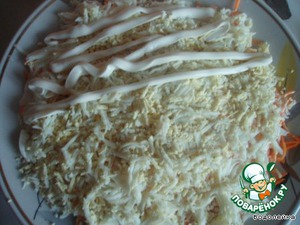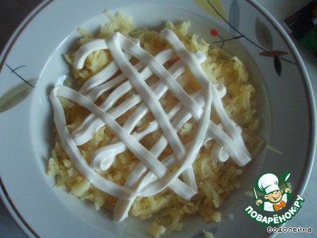 Ну и естественно каждый слой промазать майонезом хорошо. Это у меня на фото только сеточка (или чуть-чуть его), чтоб было видно и продукт и майонез.