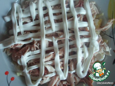 2 слой- порезанное мясо (посолить и поперчить)+майонез