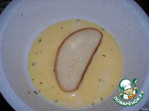 Следущий шаг - берём ломтик нарезанного уже батона и макаем его одной стороной в кляр (предварительно поставив сковороду с маслом на разогрев)