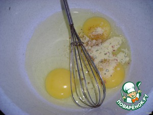 Берём оставшиеся 3 яйца, добавляем соль, базилик (в данном случае я заменил вкусовой куриной приправой "МИВИНА"), ложку майонеза, щепотку сахара и взбиваем. -