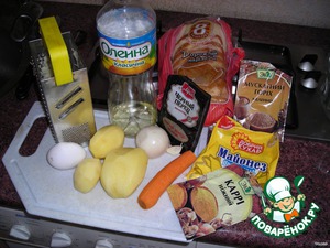 Берём картофель и натираем его на мелкой тёрке. Отжимаем жидкость, крахмал, чтобы была слегка суховата. Затем натираем лук, морковь, чеснок. Добавляем 1 куриное яйцо, перец, карри, соль и мускатного ореха по вкусу. (Главное - не переборщить мускатного ореха)