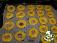 Из теста скатать шарики величиной с грецкий орех. Сформировать из них колбаски и соединить концы так, чтобы получились колечки. Разложить кольца на противень, покрытый бумагой для выпечки. |