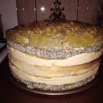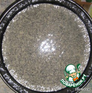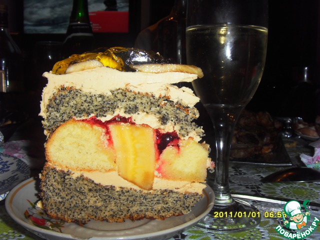 Заполнить отверстия кружочками банана. Когда желе начнет загустевать, залить верхний корж. Когда желе будет загустеет, смазать кремом. Уложить маковый корж.