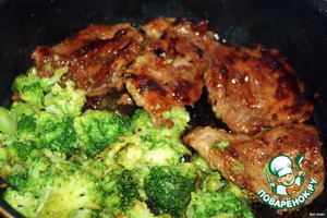 Когда свиные отбивные будут готовы, добавьте брокколи в сковороду