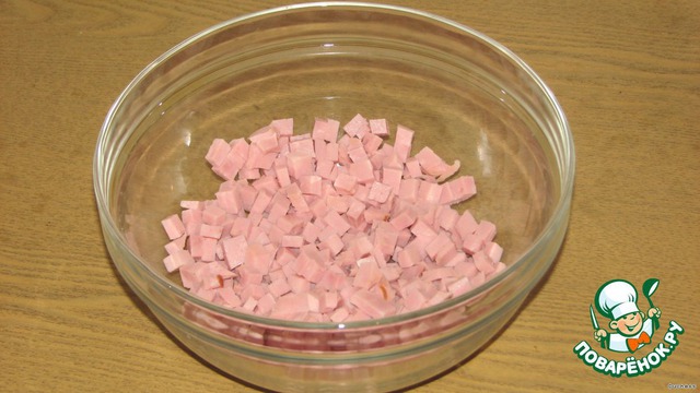 - Ветчина (лучше, если в натуральной оболочке, с видимыми кусочками мяса и минимальным количеством жира и хрящей) — 300 г