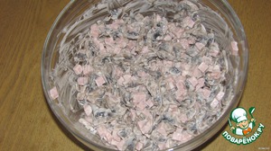 Ветчину режем кубиками, примерно, 1 см на 1 см. Смешиваем грибы и ветчину, заправляем майонезом и подаем на стол! Мы, обычно, едим его с хлебцами (Елизавета, например.. тоненькие и хрустящие))