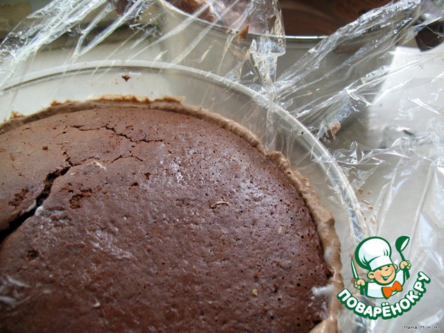 Один шоколадный корж нужно обрезать примерно до диаметра 12-14 см, второй будет основанием и должен быть равен диамтру края круглой чашке. Если больше – надо выровнять.